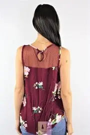 Ruffle and Lace Detail Sleeveless Tank in Burgundy Floral Print – Available in S, M, L, XL