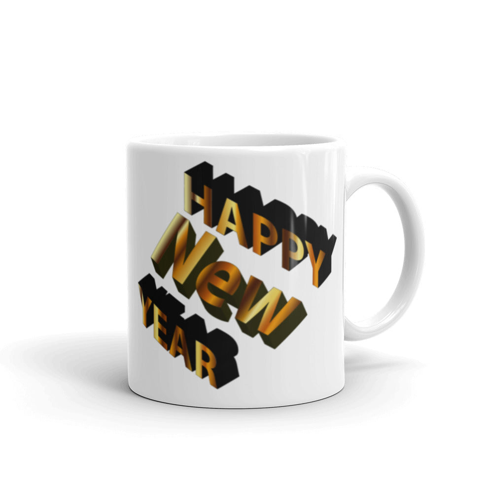 Happy New Year – White Glossy Ceramic Mug with 3D Black & Gold ‘Happy New Year’ Print, Available in 11 oz and 15 oz Sizes