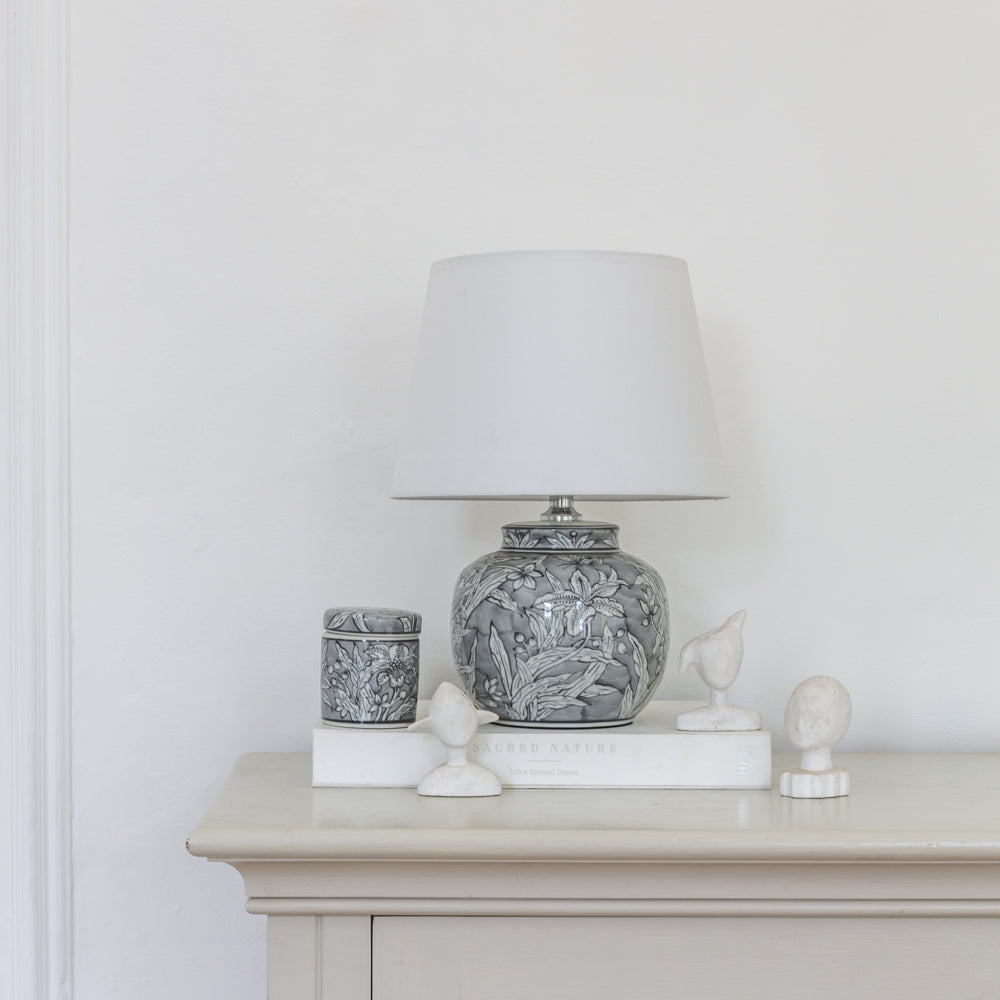Lamp Morwenna with White Shade – High – Quality Ceramic Lamp Base Set with Intricate Botanical Motifs for Home Decor