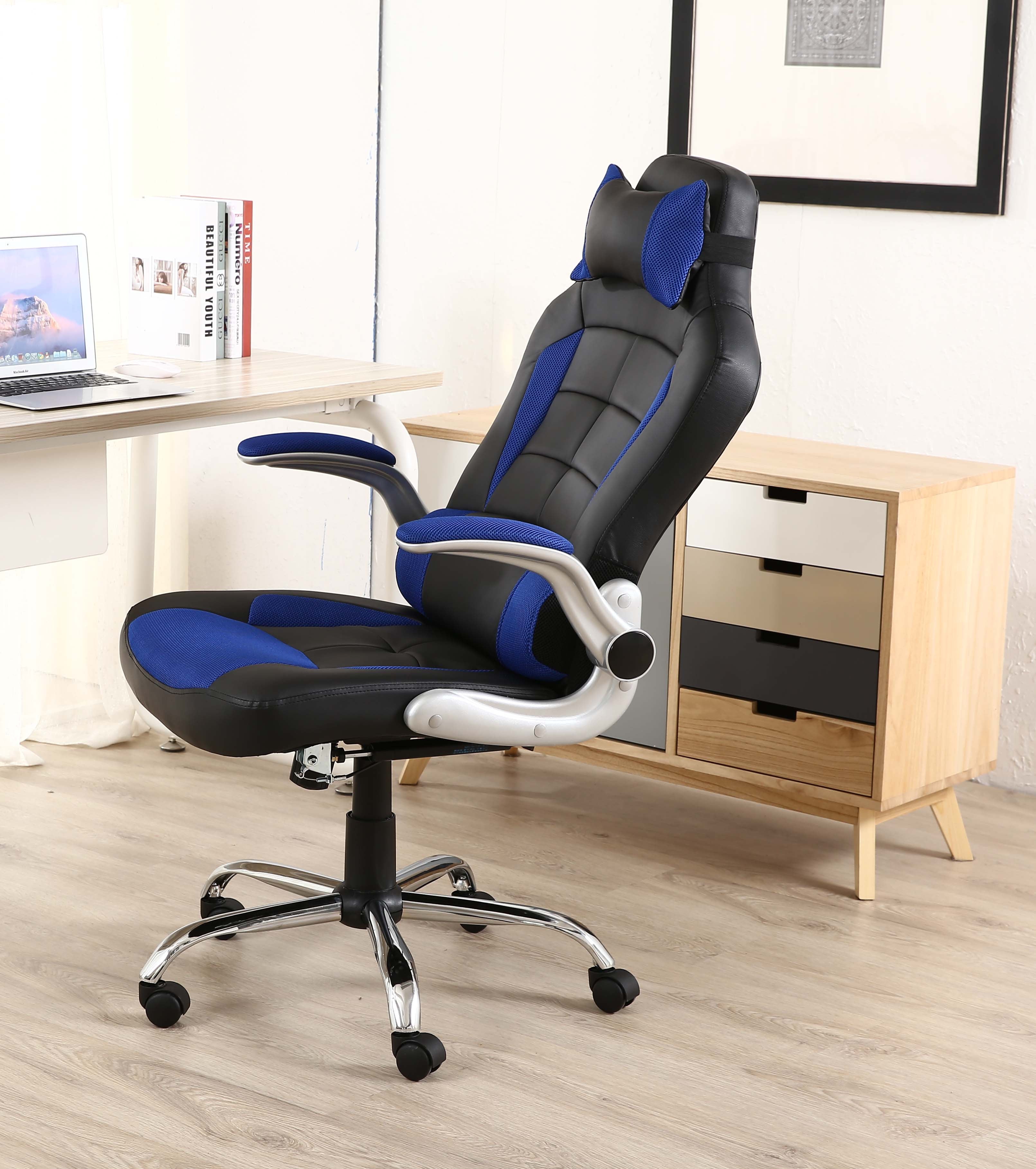 - Thick Padded flip up armrests for style, comfort, and shoulder support, along with integral lumbar support