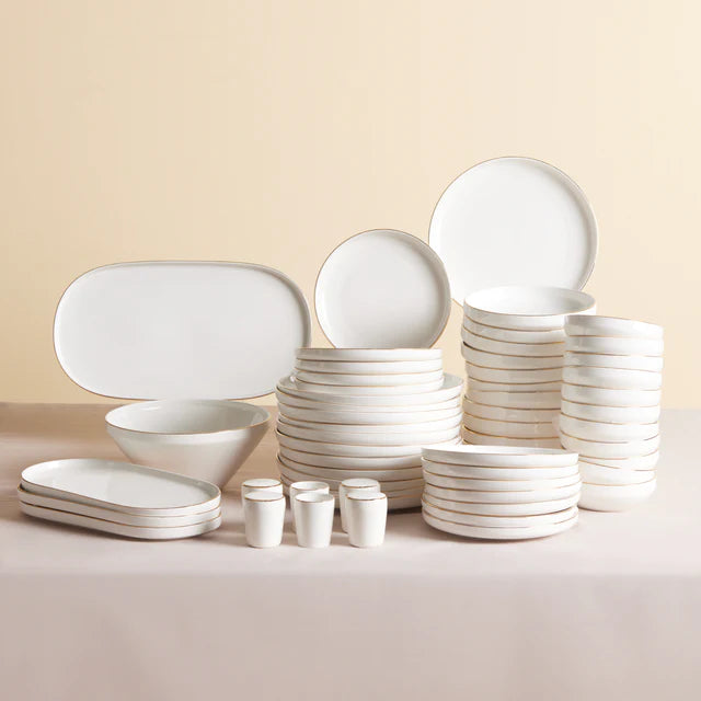 The primary color of the set is white, which serves as the base for all pieces. The gold or gold – toned trim along the edges of plates, bowls, platters, and cups adds an upscale and elegant touch, creating a cohesive and visually harmonious look.