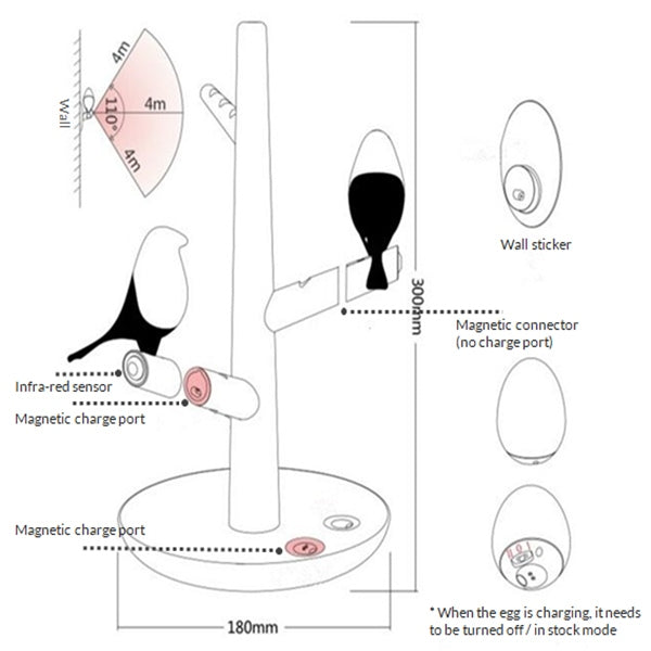 Here are some of its great features: The birds can be attached to the wall sticker, making it suitable for corridors outside bedrooms. Both the birds and eggs are detachable, and when one bird is turned on, the other switches off to save energy. The egg light mode allows you to change between 2 brightnesses and turn it on/off by patting or vibrating, with an on/off button located at the bottom.