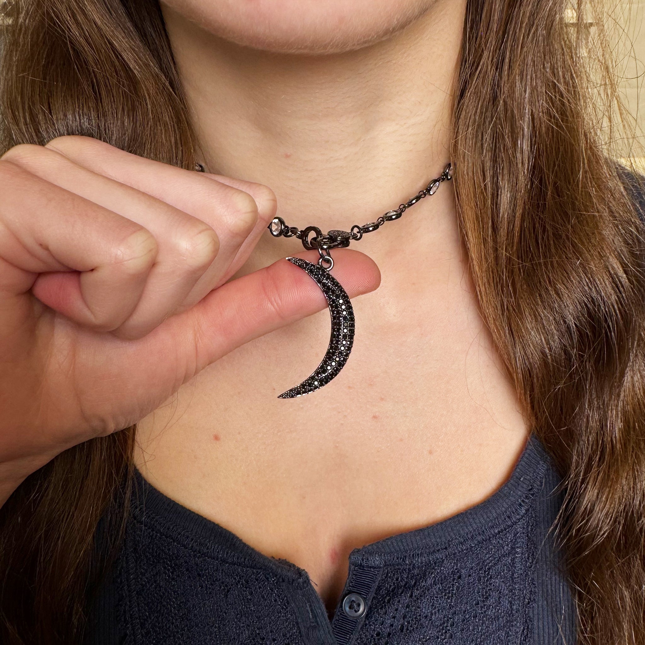 The charm is crafted with precision. The base metal is likely a polished metal alloy, such as gold – plated brass, sterling silver, or blackened/oxidized silver/steel. The surface of the crescent is encrusted with small, sparkling pavé stones, most likely cubic zirconia (CZ) or simulated diamonds, creating a continuous, dazzling effect.