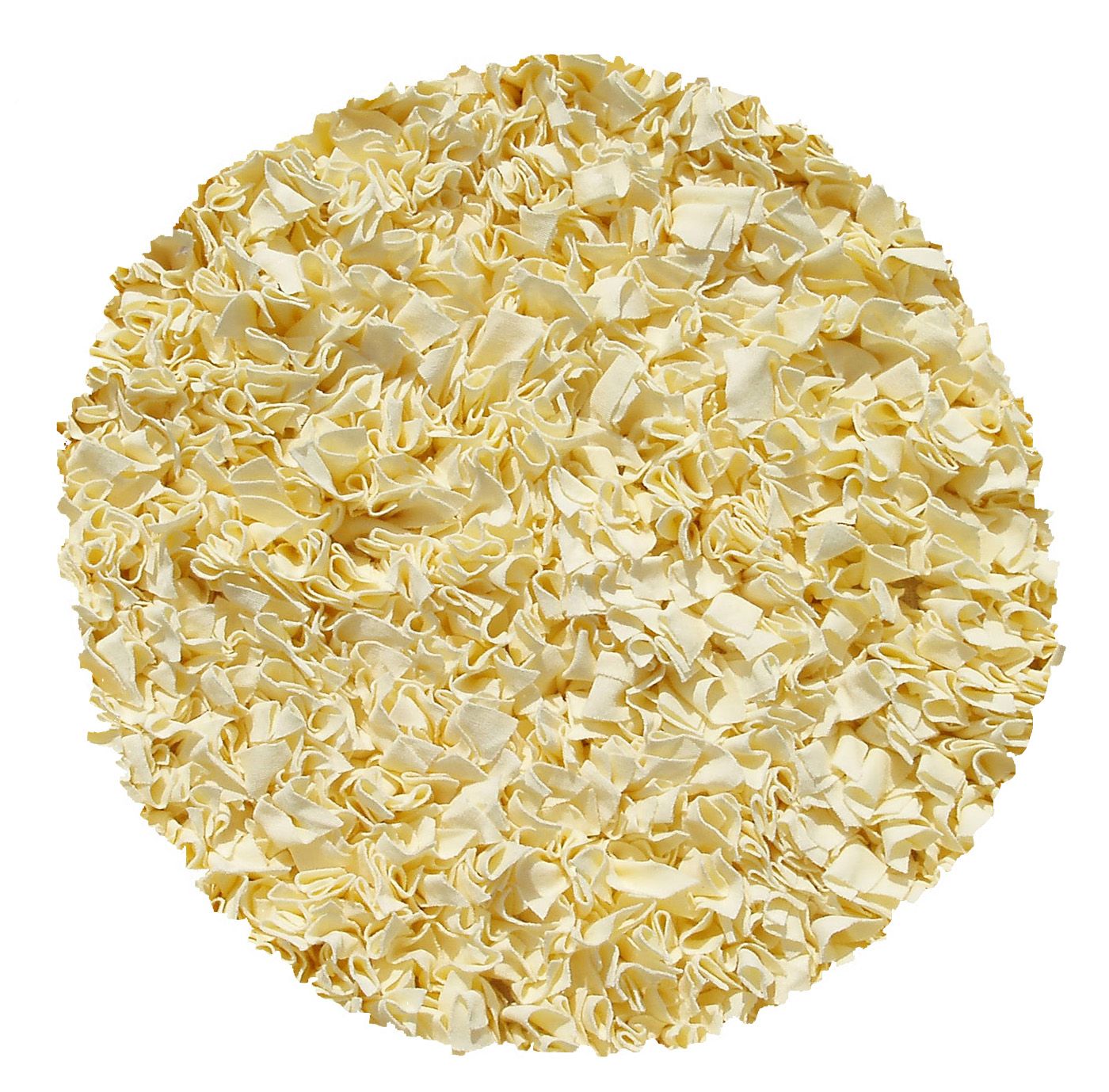The rug features a uniform, dense pattern of curled, frilly fabric pieces, resulting in a soft, plush, and tactile surface that’s ideal for kids to crawl, play, or sit on. It offers a high level of decorative appeal with its unique frilly texture, bringing visual interest and warmth to any room.