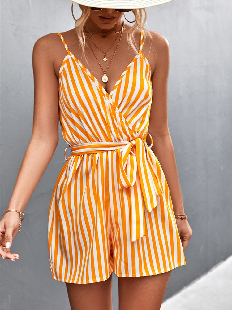 The jumpsuit features a wrap – style V – neck design that crosses at the chest, elegantly exposing the collarbones. It comes with adjustable spaghetti straps, allowing you to customize the fit to your comfort. The self – tie waist belt, which matches the stripe pattern, cinches the waist for a defined silhouette and adds a touch of structure to the overall look. The short, flared shorts, cut above the knee, provide maximum comfort and freedom of movement.