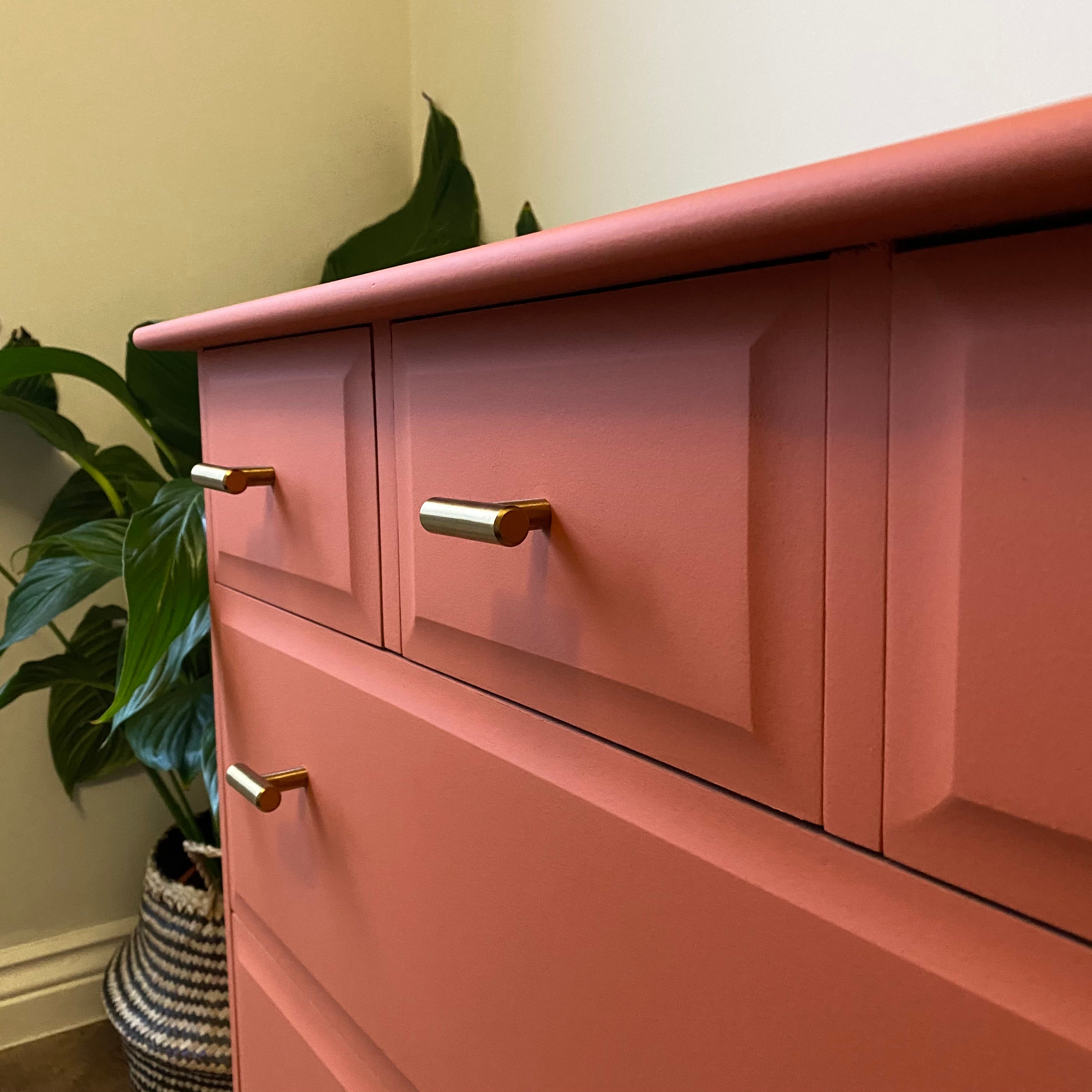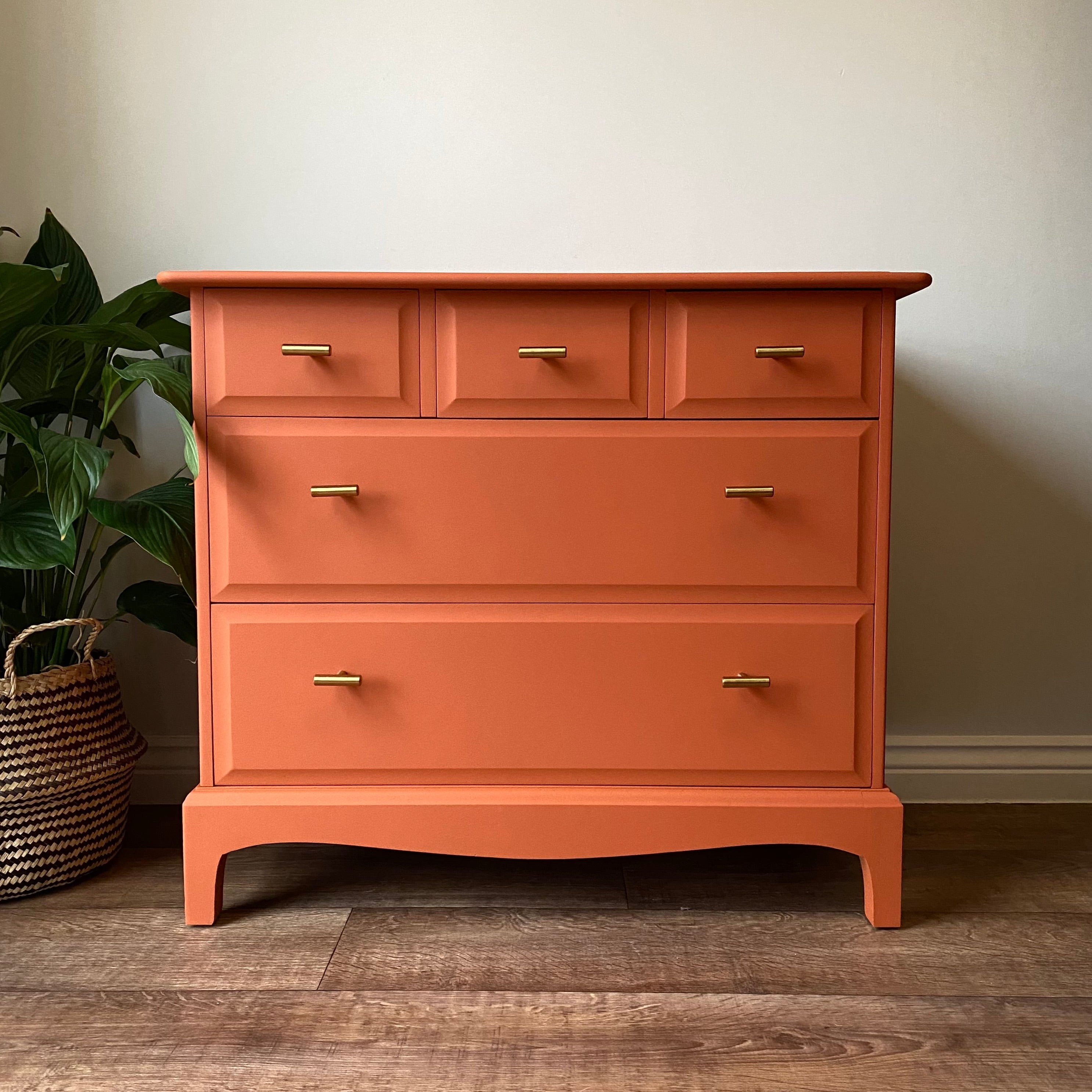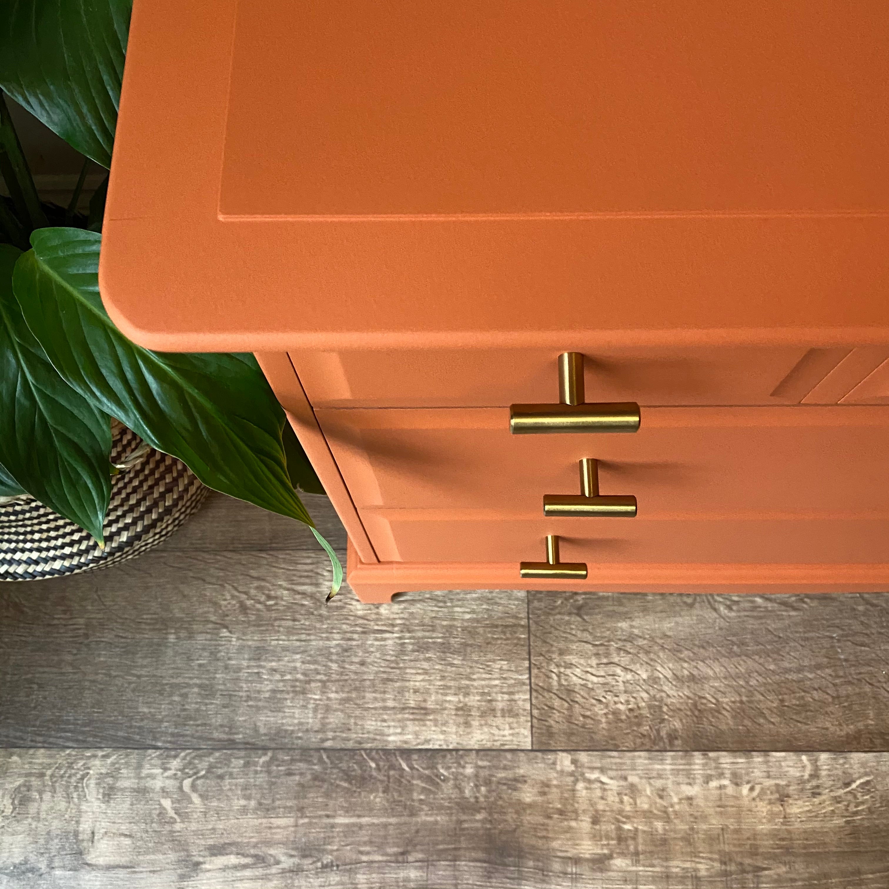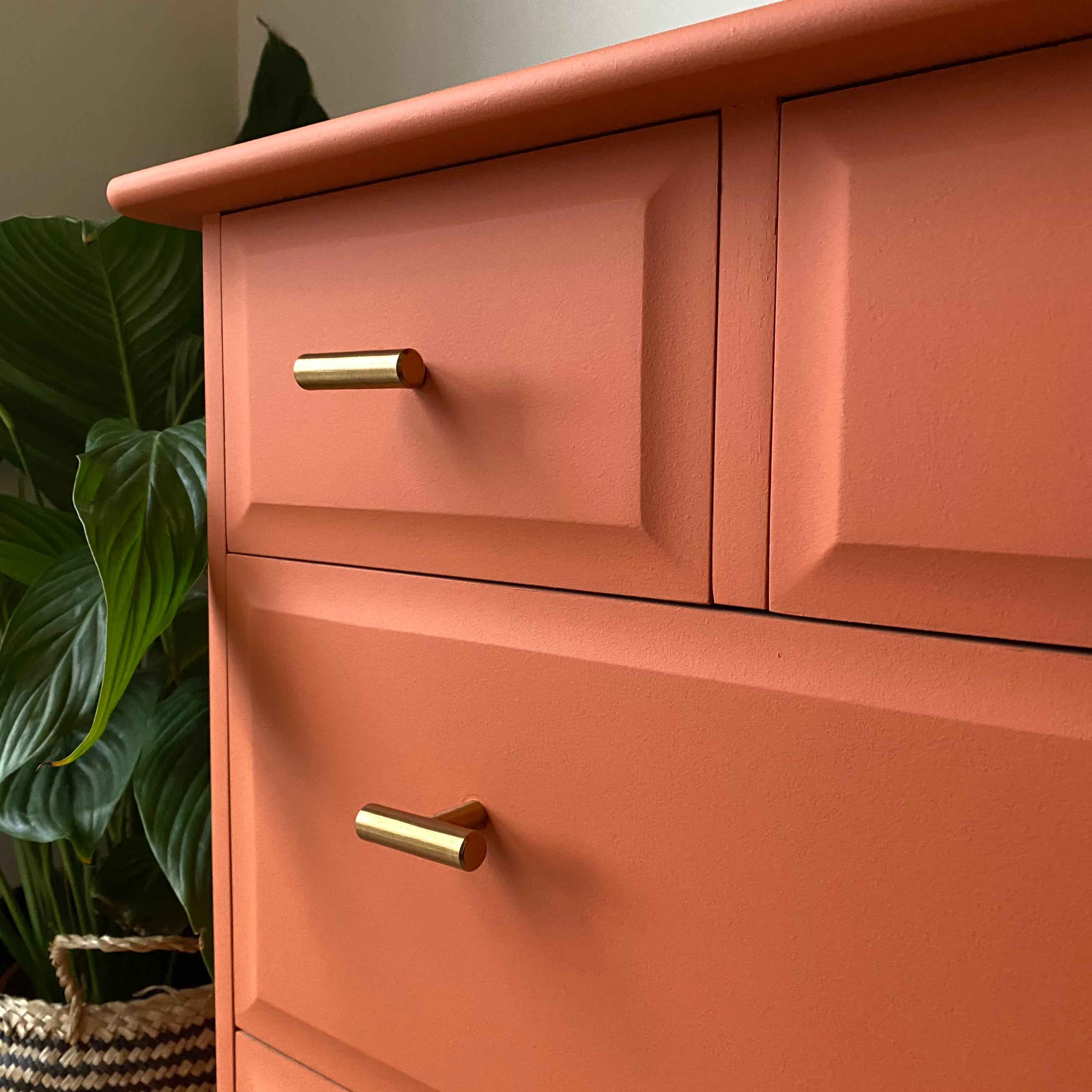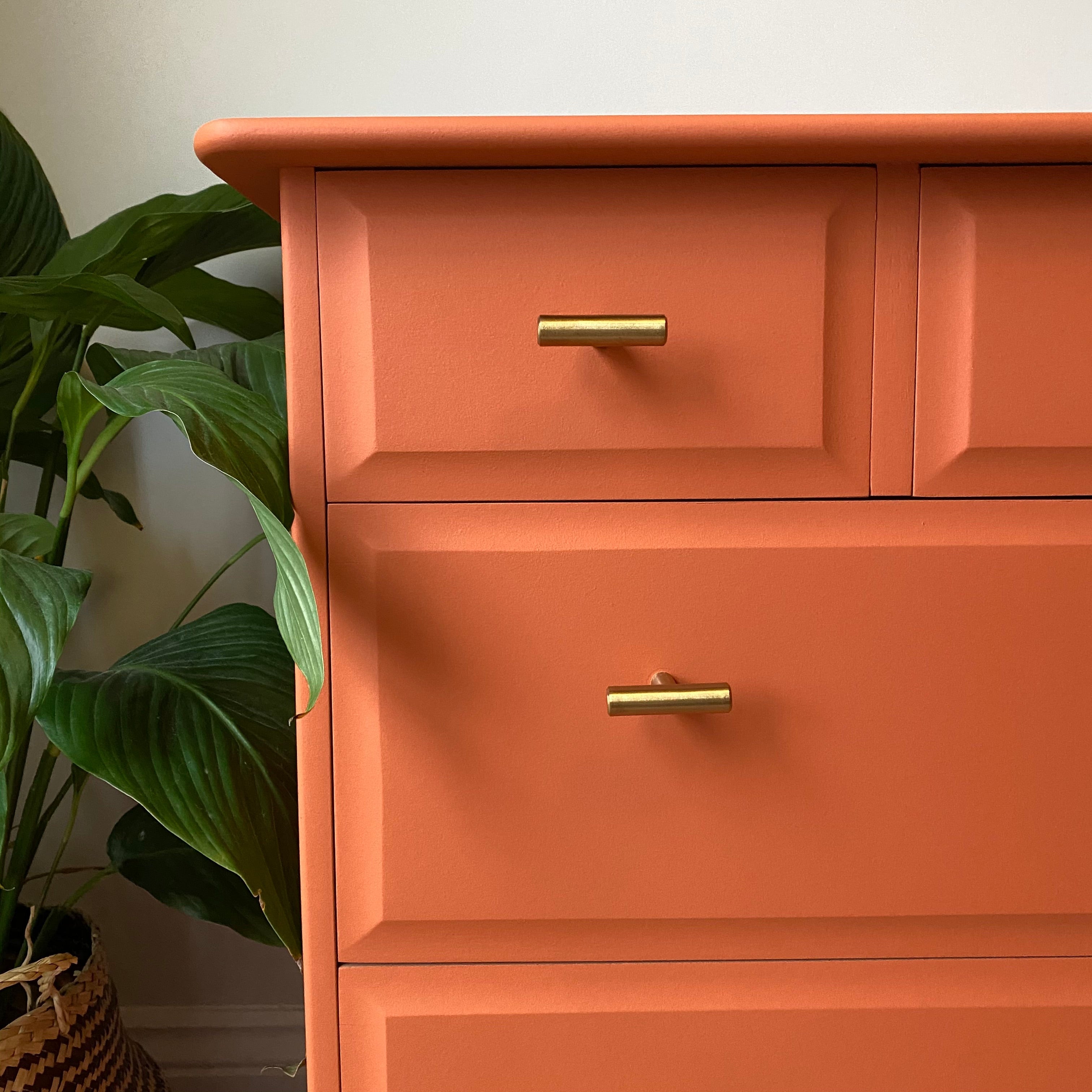 The warm, vibrant shade of coral/orange (peach – coral or light terracotta) is the primary color, giving it a retro – inspired charm. The metallic (brass or gold – toned) cylindrical pulls serve as both a functional means to access the drawers and a decorative focal point, adding a polished, mid – century modern aesthetic. The drawers have recessed paneling with subtle geometric framing, and the top three small drawers each have one central handle, while the two larger middle/bottom drawers each have two evenly – spaced handles.