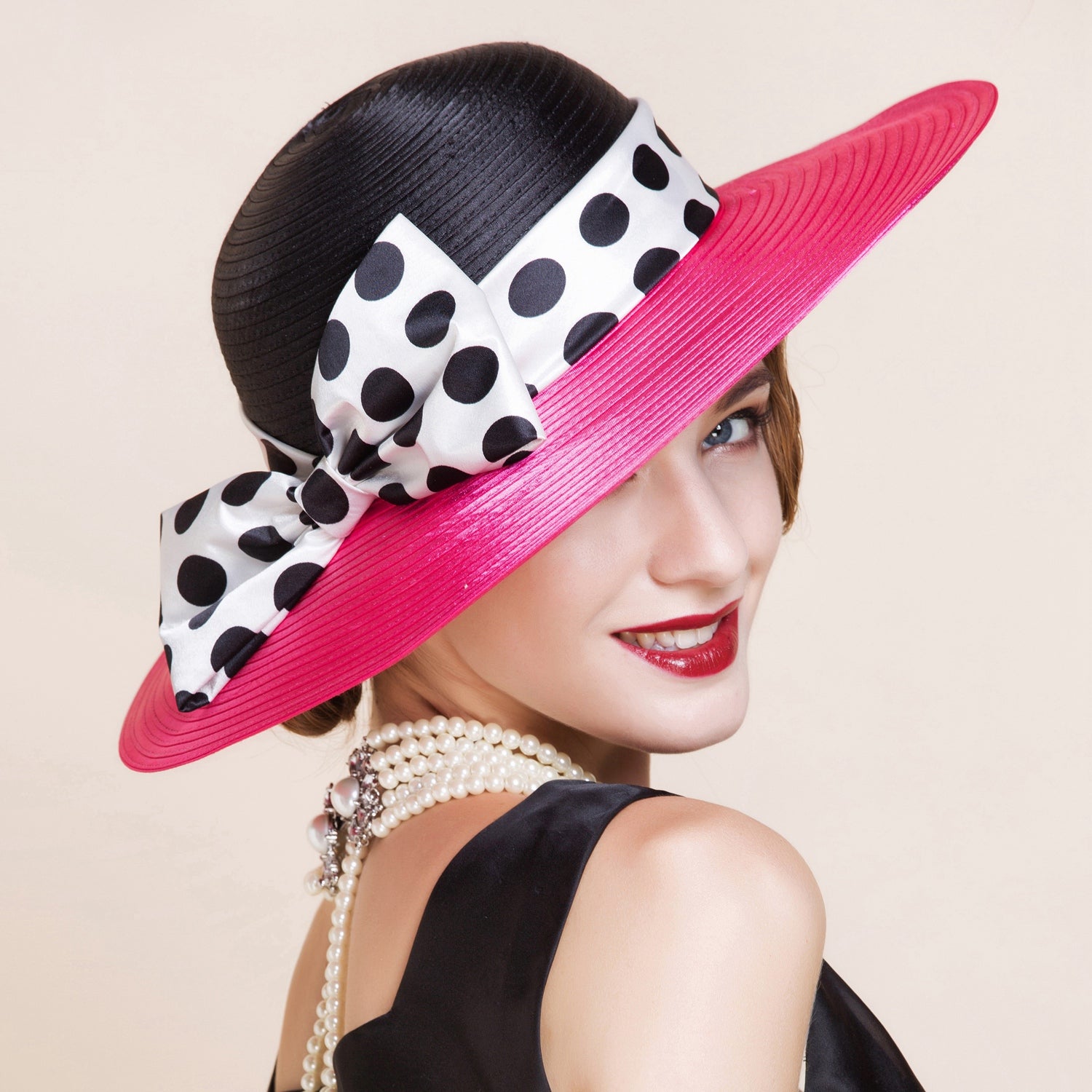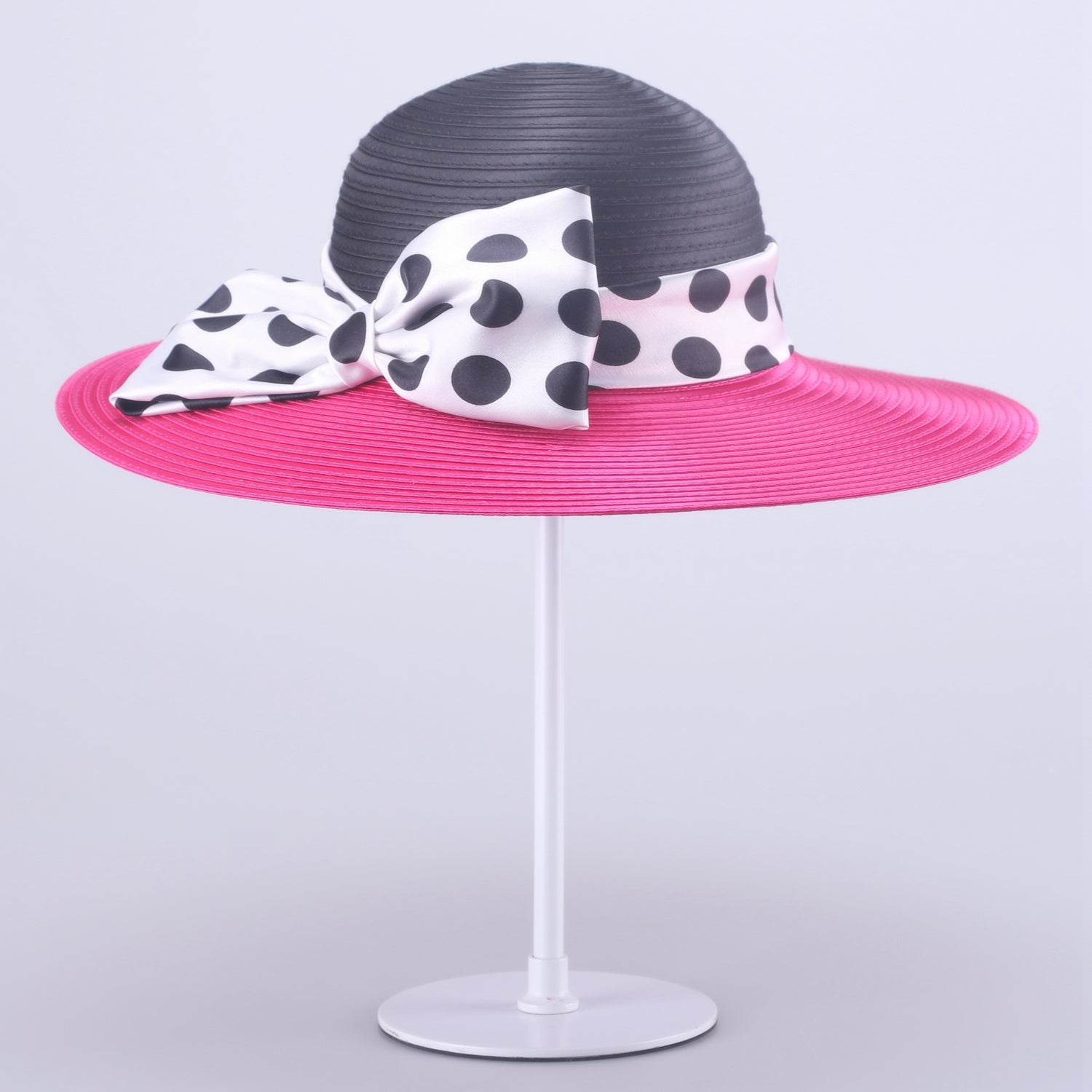 Color – wise, it features a high – contrast combination of a black crown and a bright pink (fuchsia) brim. The large, decorative bow, made of a smooth, satin – like fabric (likely silk or high – quality satin), has bold black polka dots evenly spaced across it. This bow is tied around the crown, serving as the focal point of the hat and adding a playful yet elegant touch.